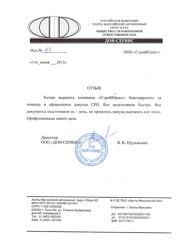 Отзывы клиентов "СтройЮрист" по вступлению в СРО в Ханты-Мансийске