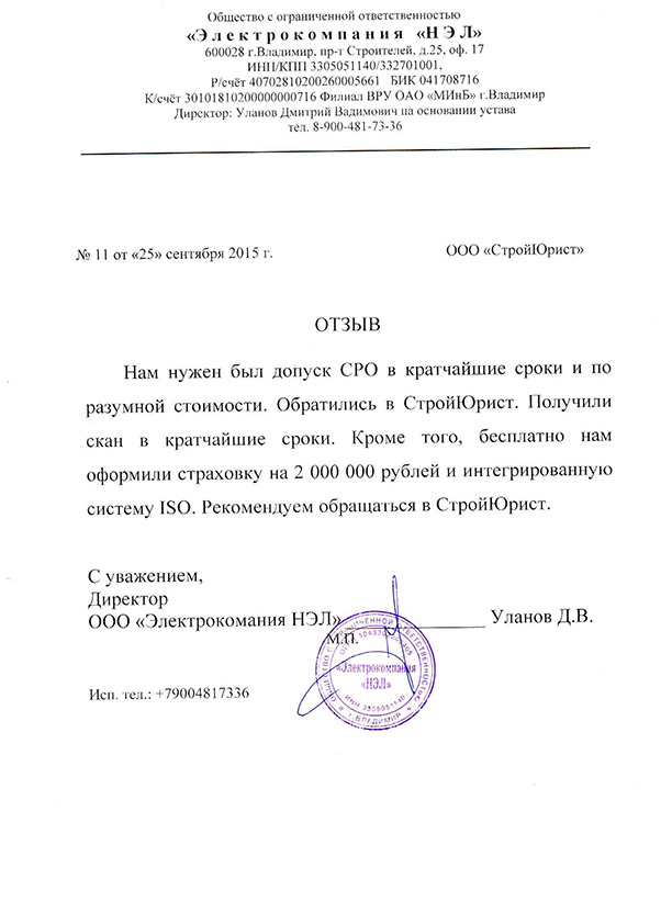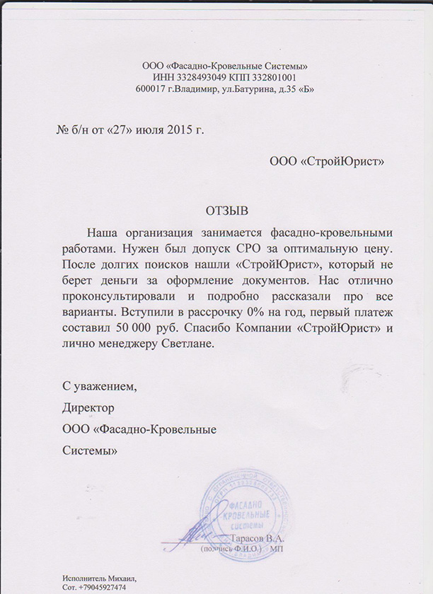 Отзывы клиентов "СтройЮрист" по вступлению в СРО в Ханты-Мансийске
